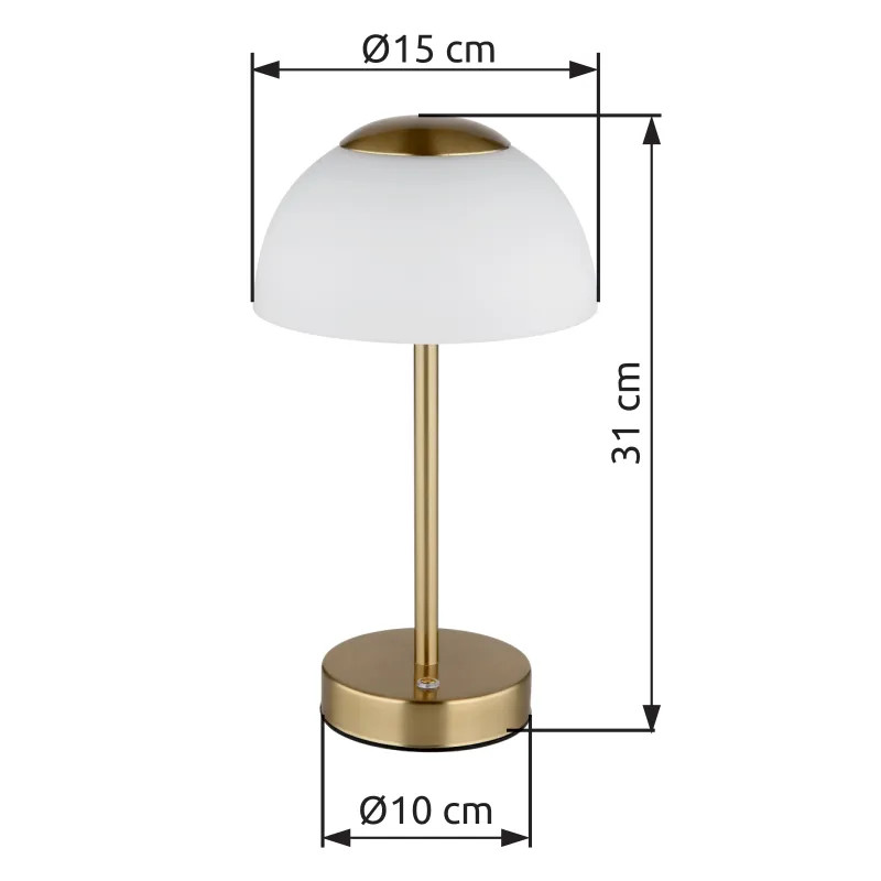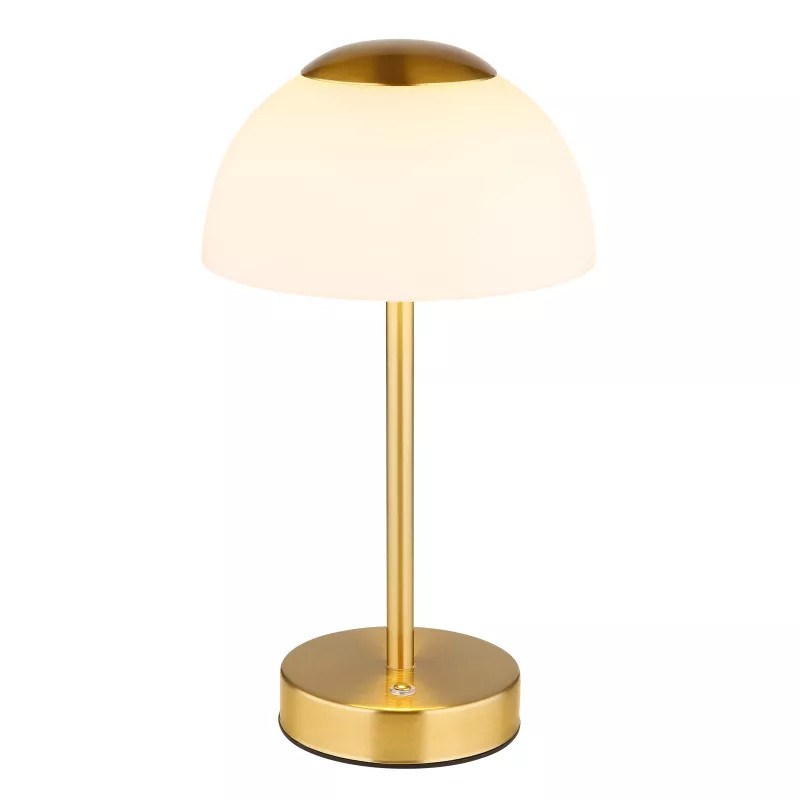 Újratölthető asztali lámpa, fém matt sárgaréz, fehér üveg, érintéses be/ki kapcsolás, fokozatmentes érintéses dimmer, CR18650 1800mAh 3.7V, töltés kb. 4 óra, világítás kb. 6-8 óra, ø: 150mm, M: 310mm, LED 2.5W 230V, 243lm forrás, 150lm kimenet, CCT 2
